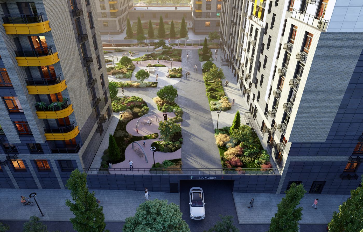 Закрытая территория домов, расположенная на стилобате, обеспечивает достойный уровень безопасности и уединения. Здесь появятся прогулочные зоны и благоустроенные скверы, где можно будет отдохнуть и пообщаться с соседями. В самом центре квартала будет детский сад и зеленый парковый сквер, а между первым кластером расположится физкультурно-оздоровительный комплекс. На первых этажах разместятся кофейни, магазины, салоны красоты и прочие коммерческие услуги. Все нужное для жизни будет в шаговой доступности.