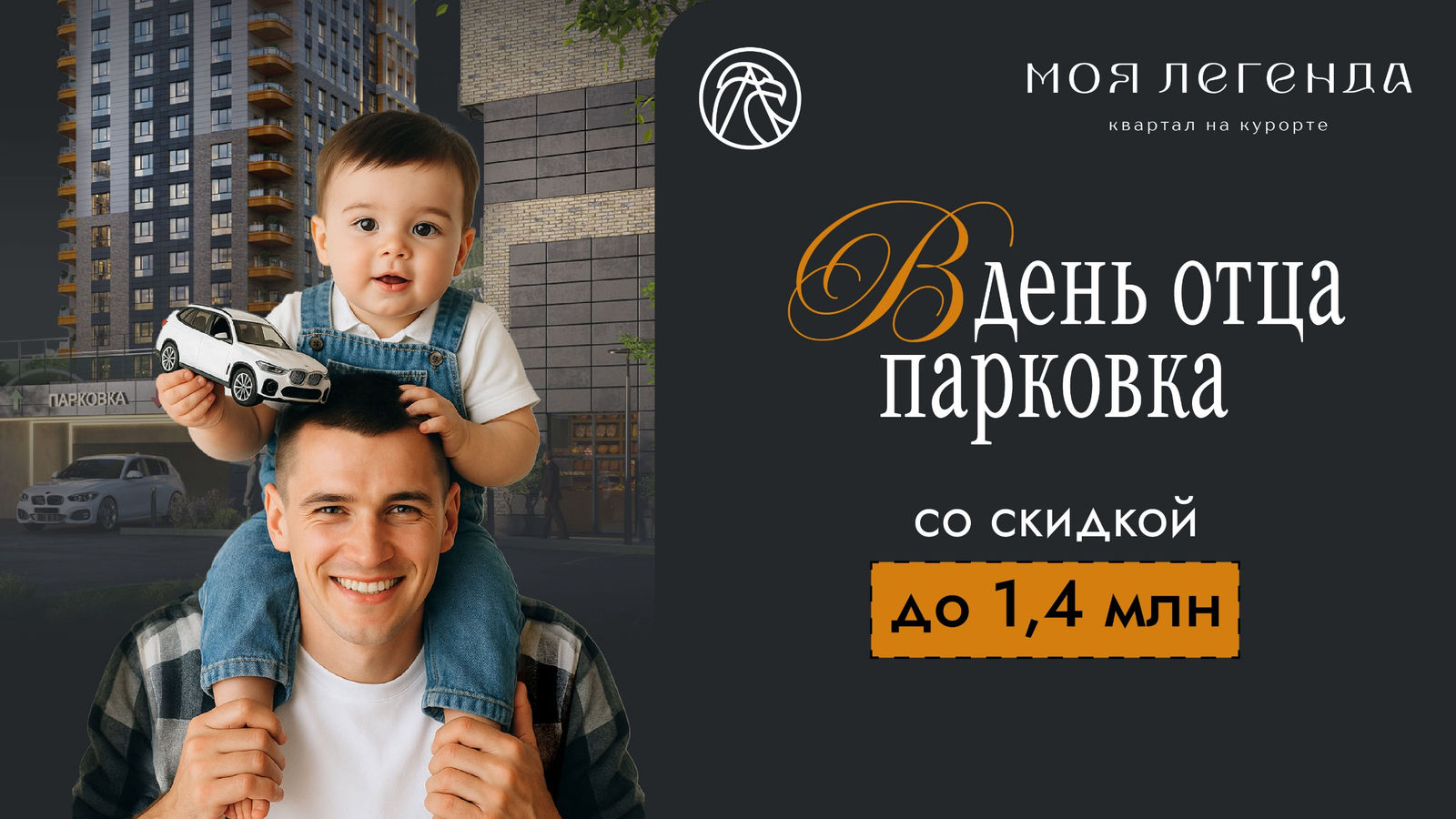 В честь Дня отца ГК «ЮгСтройИнвест» запускает особую акцию для тех, кто всегда выбирает надежность, комфорт и заботу о близких. С 19 октября по 2 ноября при покупке 2- или 3-комнатной квартиры в квартале на курорте «Моя Легенда» вы получаете парковочное место со скидкой до 1,4 млн рублей!